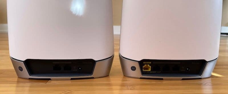 The Orbi nodes aren’t interchangeable. The Orbi “router” has the Ethernet port for the internet, then three additional Ethernet ports. The “satellite” node has two ethernet ports leaving you with five ports to nerd out on with the two-piece setup.