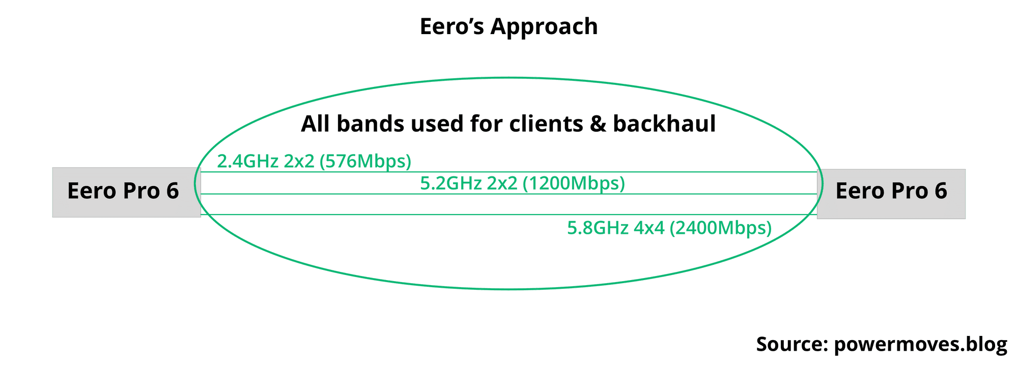 Eero Pro 6 uses a “true multi-channel mesh network,” which means that all three bands are used in communicating from node to node, while these bands are also used for the clients (your devices).
