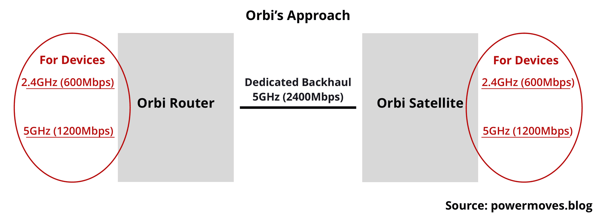 Orbi RBK752 is a tri-band system, just like Eero. But its approach differs because one of the channels (5GHz, 2400Mbps) is a dedicated backhaul channel that’s only used to communicate with other Orbi, which leaves the other two channels open for clients (your devices).