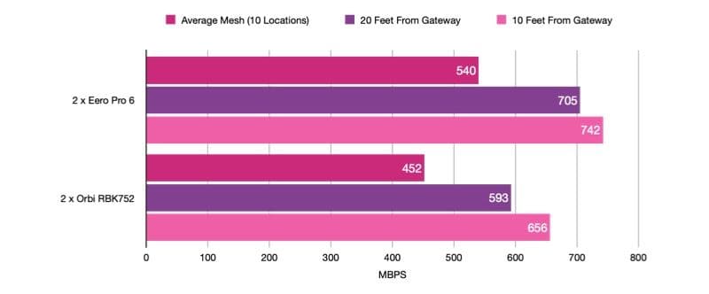 When testing from my ten designated locations, I averaged 540Mbps, with two Eero Pro 6 nodes. When just 10 feet from the main router, I averaged 742Mbps.