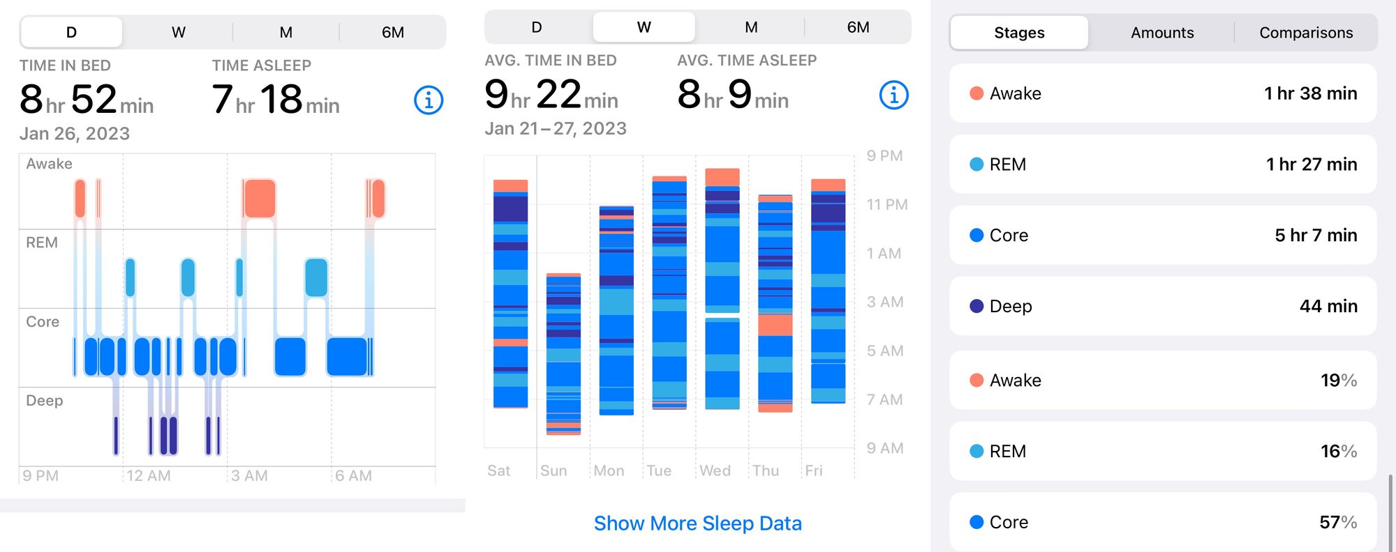 It tracks your time in bed, time asleep, and time awake, and breaks the time slept into REM, core, and deep sleep, and graphs the data.