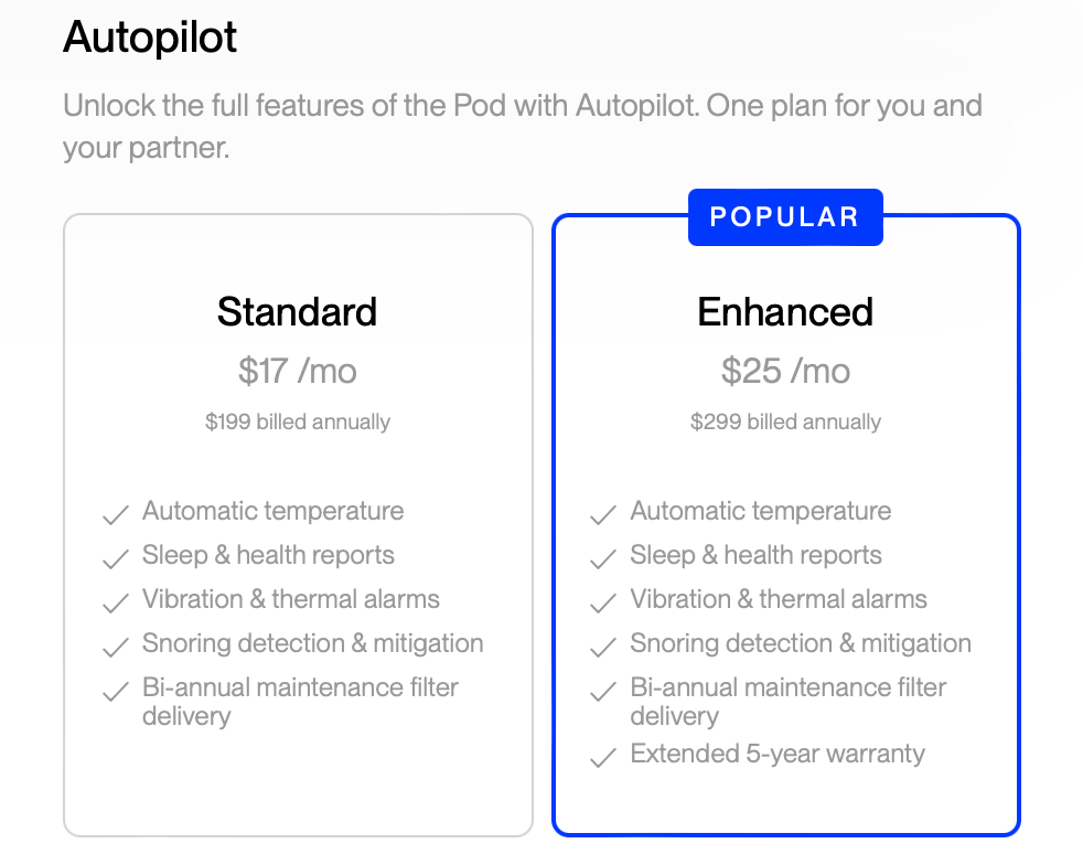 A couple of years ago, Eight Sleep put the majority of its features behind the paywall. Now, the Autopilot Standard ($199/year) subscription is mandatory for the first year of ownership.