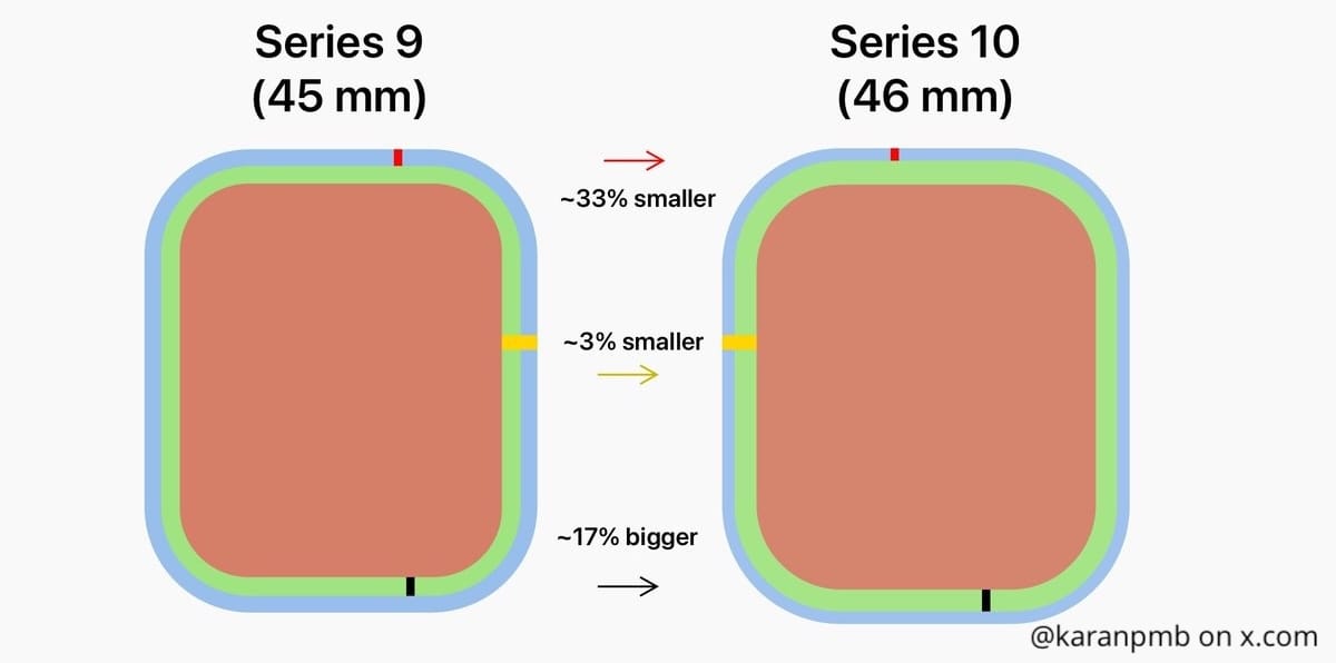 Despite the Series 10’s larger bezels, it delivers more pixels and a bigger screen overall, thanks to drastically thinner metal edges around the display while maintaining a similarly sized case to the Series 9 (see graphic above). And the 46mm model has the screen real estate to match the Ultra, but in a smaller package. Its design is more lowkey than the Ultra, which is good for anyone looking for a cleaner design that isn’t shouting for attention.