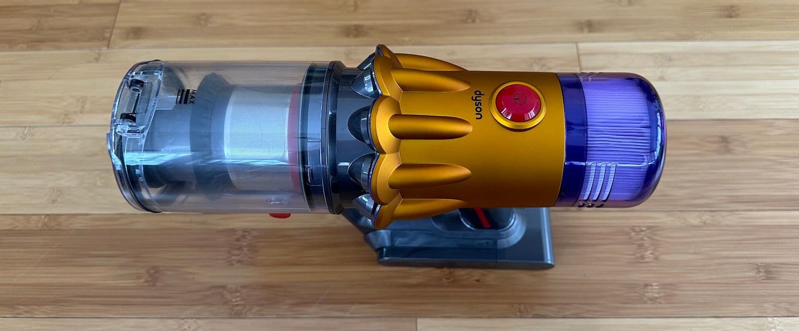 The V12, on the other hand, features a single-button power control. Instead of holding down a trigger, the V12 can be easily turned on by pushing the red button. This single-button turn-on is a new feature for cordless vacuums, and I'd be surprised if all future Dyson models don't adopt this design.