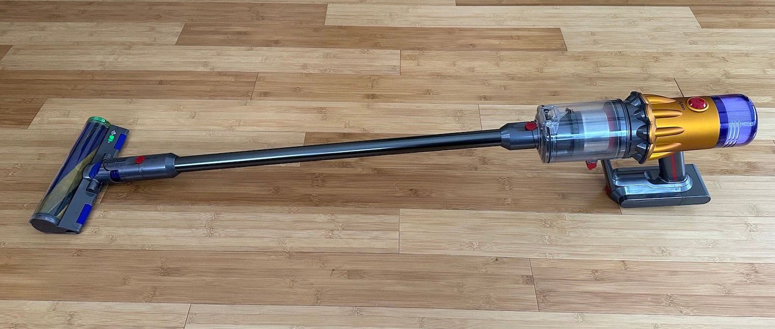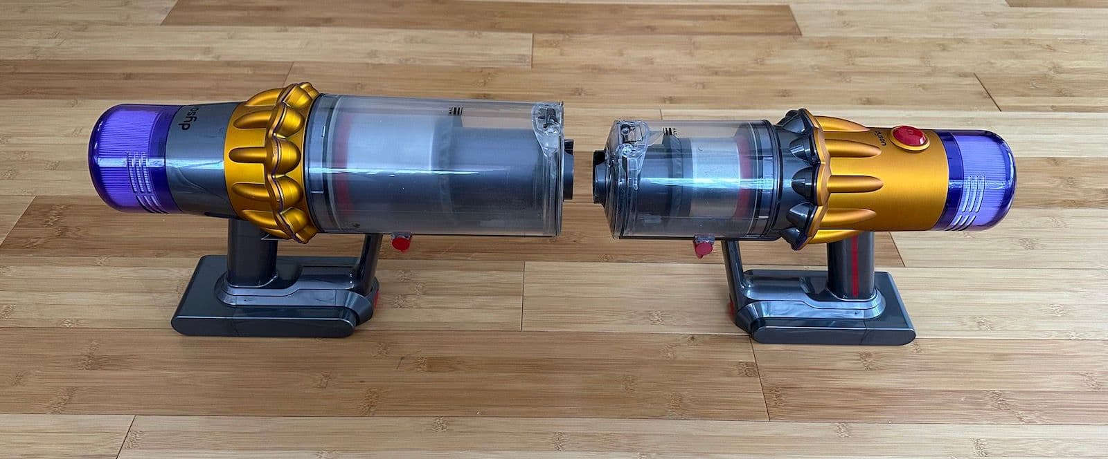 The V12 and V15 have a difference in their power controls. The V15, as with all other Dyson vacuums, features a red trigger that needs to be held down to power the vacuum. This trigger design allows for more control over power usage by easily releasing when you’re done, which is great for battery optimization.