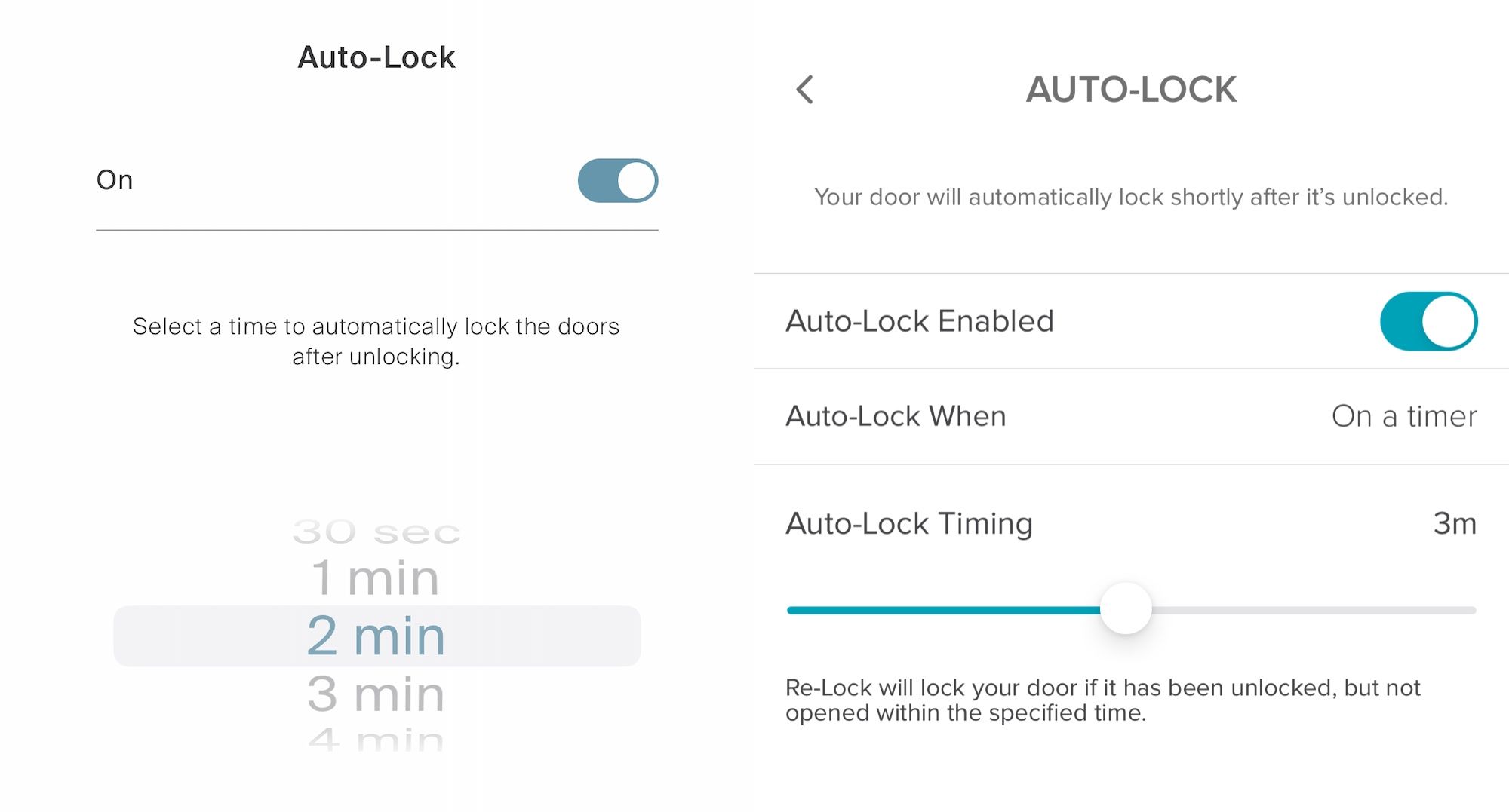 Both locks have auto-lock timers that can be set at different time intervals after the lock has been unlocked.