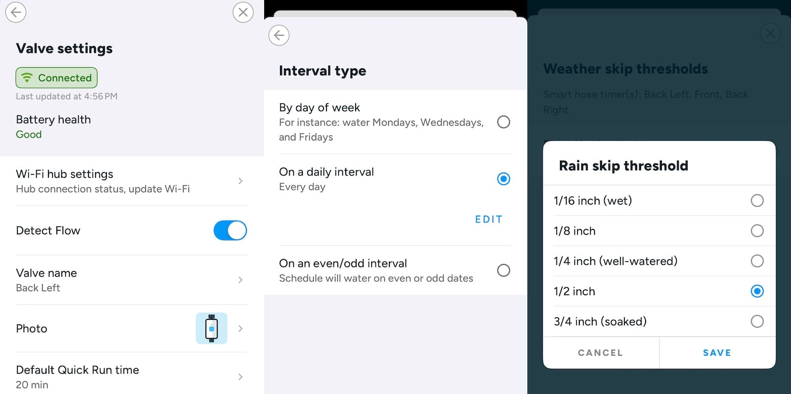 Weather skip: The timer won't run if rain is in the forecast. You can set a threshold from 1/16" to 3/4".