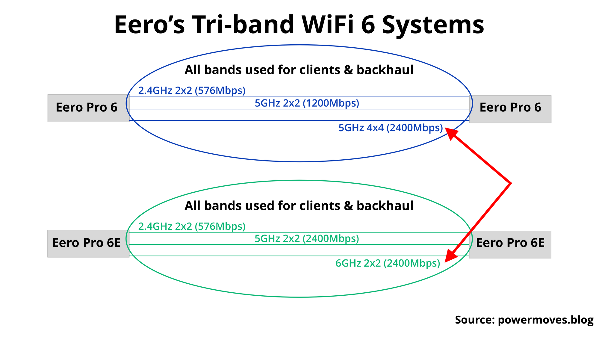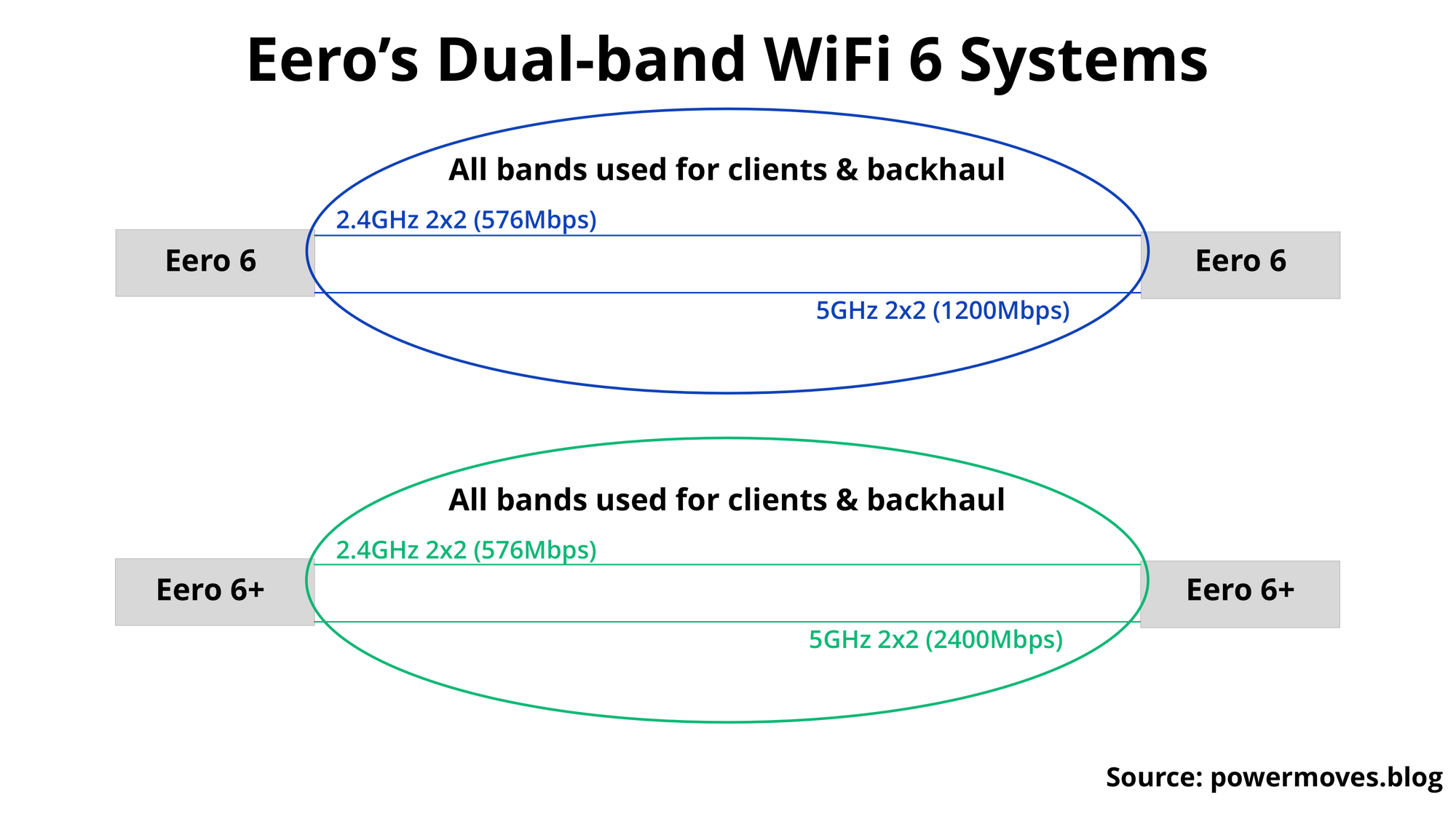 Eero 6 and Eero 6+ are dual-band systems (5GHz and 2.4GHz), which means a chunk of your total bandwidth from the 5GHz band will be wasted on backhaul communication (Eero nodes communicating with each other).