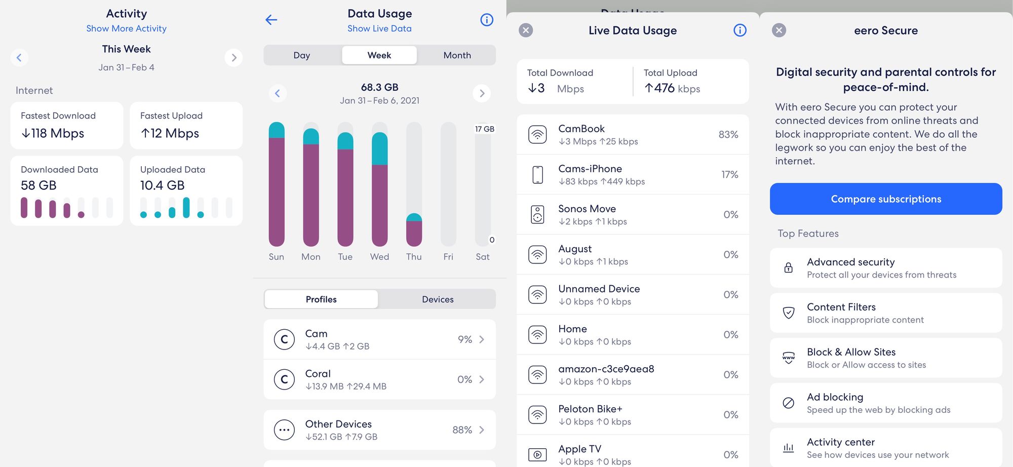 There’s also an interface that displays your devices in order of real-time bandwidth usage, which is helpful for troubleshooting when the network or a device isn’t running as intended. The amount of bandwidth each profile or device is consuming for the current week is displayed too, but you’ll need Eero Plus for $99/year if you want full access to historical bandwidth usage, content filtering, and ad-blocking.
